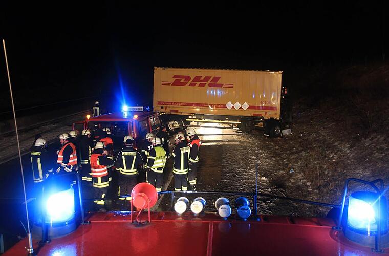 Nach den Niederschlägen am Tag zogen die Temperaturen merklich an und verwandelten die Autobahnen in gefährliche Rutschbahnen. Auf der A71 bei Mellrichstadt im Landkreis Rhön-Grabfeld war ein Lkw-Gespann gegen Mitternacht talwärts unterwegs in Richtung Schweinfurt. Obwohl der Fahrer bereits vorsichtig unterwegs war, merkte er, wie er langsam die Kontrolle über sein Fahrzeug verlor, berichtet ein Pressefotograf vor Ort. Völlig unkontrolliert rutschte der Container-Laster über die Bahn in die Böschung, wo die Deichsel brach und der Anhänger umstürzte. Sofort stieg der Mann aus, um seine Kollegen und Autofahrer zu warnen und die Unfallstelle abzusichern.