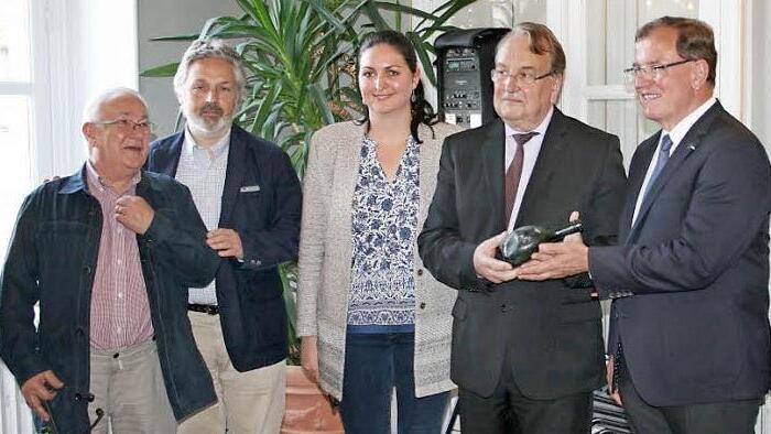 Vor diesem Hintergrund würdigte Dotzel in einer kleinen Ansprache die große historische Leistung, nach den beiden großen Kriegen des vergangenen Jahrhunderts den Weg in eine friedliche Zukunft gefunden zu haben. Als entscheidend lobte Dotzel die Bereitschaft der Franzosen, die Hand zur Versöhnung auszustrecken. "Das war die Chance für uns Deutsche, in den Kreis der zivilisierten Völker zurückzukehren - nach den Verbrechen, die im deutschen Namen geschehen waren", sagte der Bezirkstagspräsident. Claude Leteutre, der Präsident des Gemeindeverbandes Falaise, bedankte sich für die Leihgabe aus Kitzingen mit den Worten: "Ich habe immer gesagt, dass sich die Geschichte von Falaise und die Geschichte zahlreicher deutscher Städte oft sehr nahe sind." Symbolhaft soll der alte "Bocksbeutel", von der irrsinnigen Hitze nach dem Luftangriff deformiert, das Leiden der Kitzinger Zivilbevölkerung zum Ausdruck bringen.
