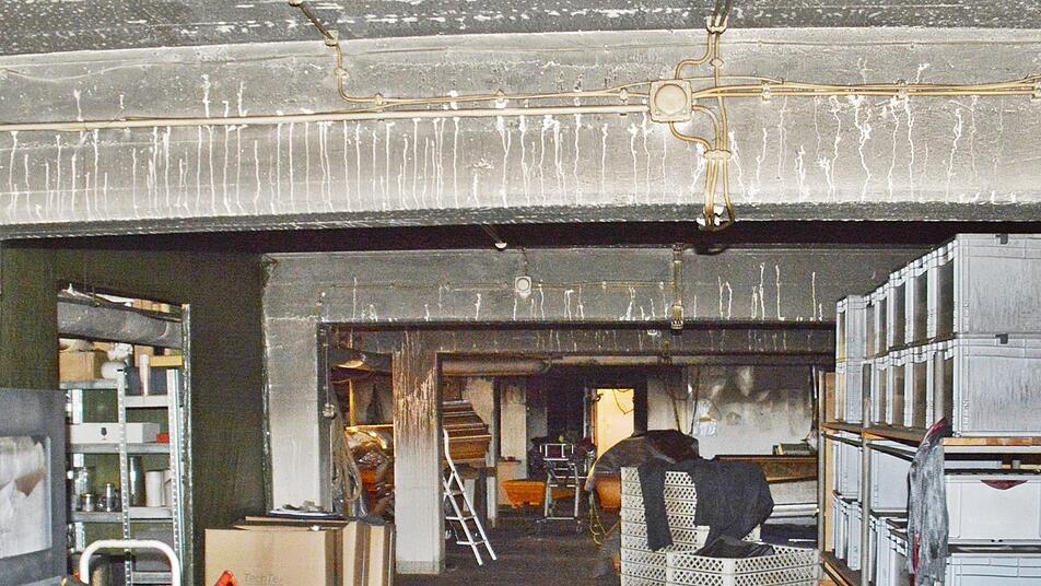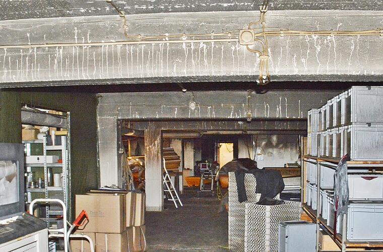 Beim Blick in das Kellergeschoß lässt sich das Ausmaß des Feuers nur erahnen. "Wir dürfen hier noch nicht weiter, da die Ermittlungen der Gutachter zur Brandursache nicht vollständig abgeschlossen sind", erklärt Thomas Fischer. Fest steht jedenfalls, dass das Feuer in einem Vorbereitungsraum ausgebrochen ist, in dem Innenausstattungen für Särge, wie Decken und Kissen lagerten und sich Personal- sowie Hygieneraum befanden. Glück im Unglück war, dass zwischen einem weiteren Raum, in dem die Holzsärge lagern, eine Wand ist, die ein Übergreifen der Flammen verhinderte.