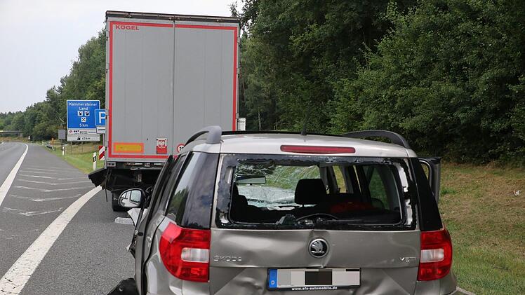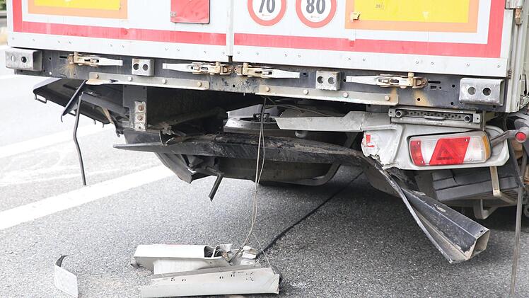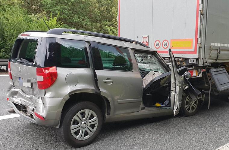 Dagegen übersah der Fahrer eines Sattelzuges den langsamer werdenden Verkehr und fuhr auf den Skoda auf. Dabei schob der Sattelzug das Auto unter den Hänger eines anderen Lkw.