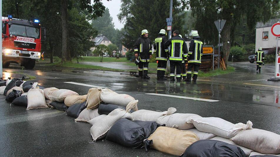In Unterweißenbach bei Helmbrechts war der Ortskern komplett unterspült. Rettungskräfte versuchten am Abend ihr Möglichstes, um den Wassermassen mit Hilfe von Sandsäcken und Wasserpumpen Herr zu werden.