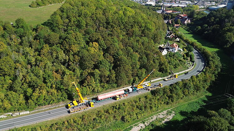 Nach Angaben des Polizeipräsidiums Unterfranken blockiert der Transporter die komplette Fahrbahn, nachdem ein Teil der Ladung verrutscht ist. Bei der Ladung soll es sich laut Matthias Volpert vom Würzburger Kranverleih um einen Kesseltank gehandelt haben.