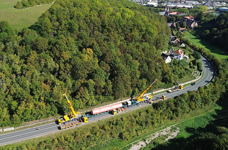 Ein Schwertransport sorgt seit den frühen Donnerstagmorgenstunden (14.09.2023) für Verkehrsbehinderungen auf der Hettstadter Steige bei Zell am Main.