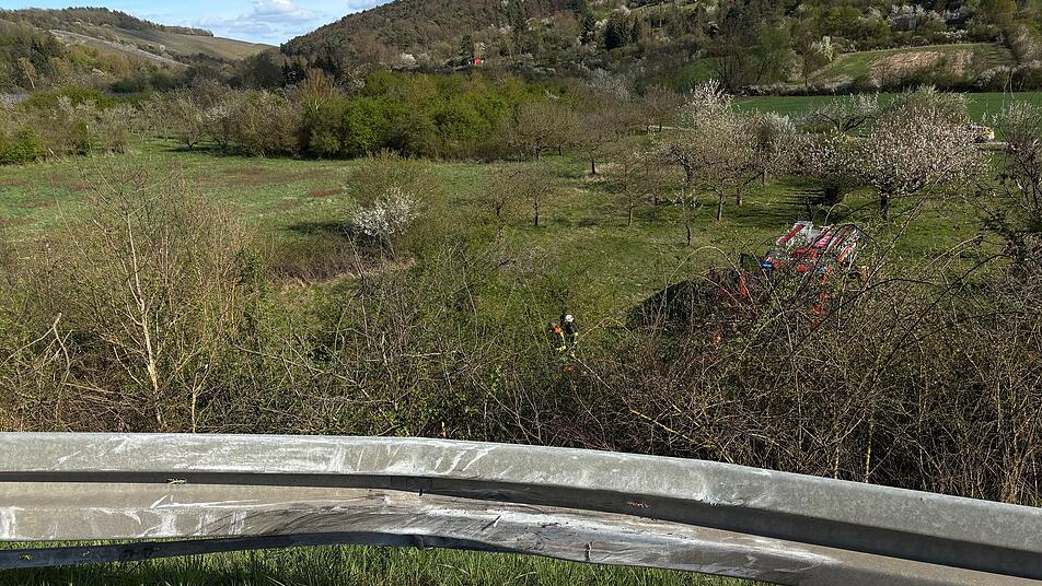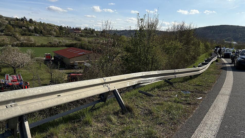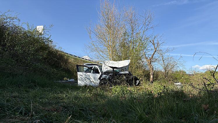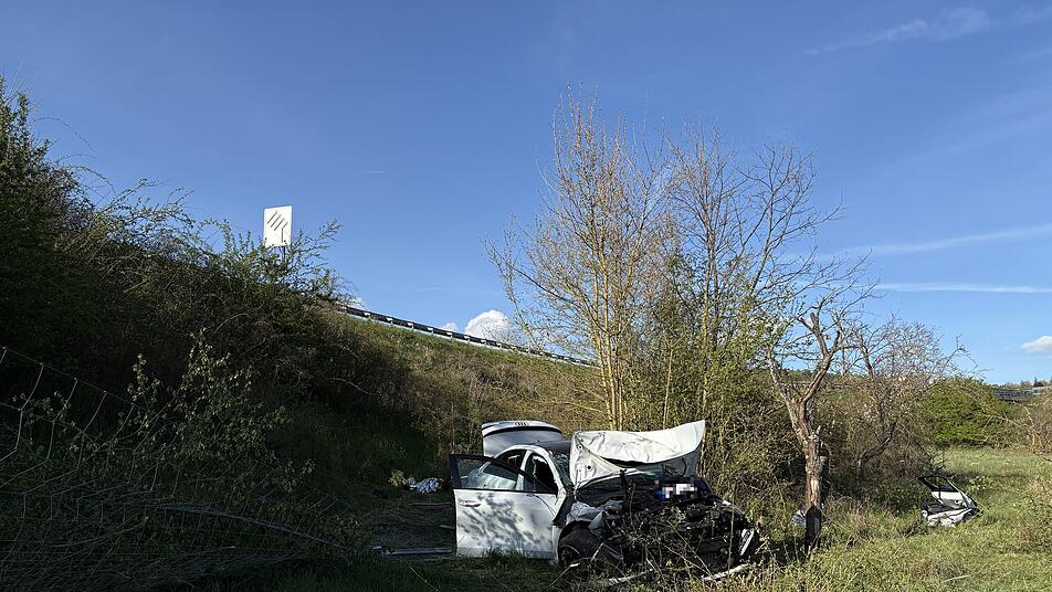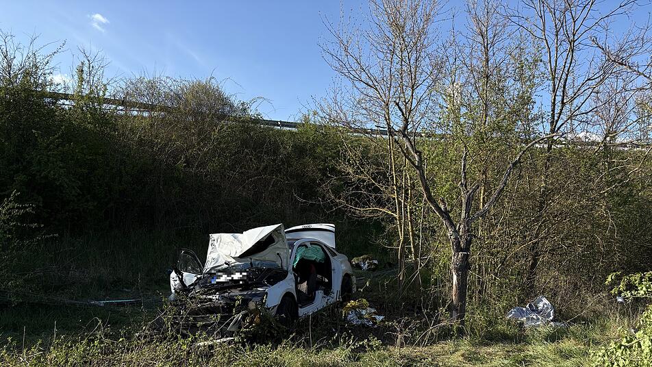 In der Kurve bei der Abfahrt Würzburg-Randersacker streifte das Auto einen Transporter, geriet auf den Grünstreifen und schoss mit hoher Geschwindigkeit aus der Kurve über die Leitplanken in einen Graben neben der Autobahn. Dort lieb der Wagen demoliert liegen.