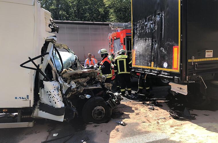 Weitere Bilder vom Unfall auf der A3Der Verkehrsunfall ereignete sich kurz nach 9.30 Uhr zwischen den Anschlussstellen Rottendorf und Würzburg/Randersacker. Ein Klein-Lkw mit hessischer Zulassung war auf der rechten Spur in Richtung Frankfurt unterwegs, als er offenbar das Stauende übersah und mit großer Wucht auf das Heck eines bereits stehenden Sattelzugs auffuhr. Das Führerhaus des auffahrenden Lkw wurde so stark beschädigt, dass der Fahrer noch an Ort und Stelle verstarb. Wie die Polizei Unterfranken mitteilt, handelt es sich bei dem Verstorbenen um einen 47-Jährigen aus Hanau.