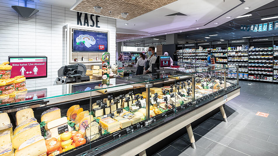 Ein zentrales Element des Supermarkts ist die über 30 Meter lange Servicetheke, an der Fleisch, Fisch und Käse angeboten werden. "Besonders ist, dass die Kund:innen bei der Zubereitung ihrer Bestellung oder der Ware für die Theke den Mitarbeitenden an den Servicepoints zusehen können", teilt die Sprecherin mit. Das Sortiment umfasst zudem zahlreiche pflanzliche Alternativprodukte sowie einen großen Getränkemarkt.