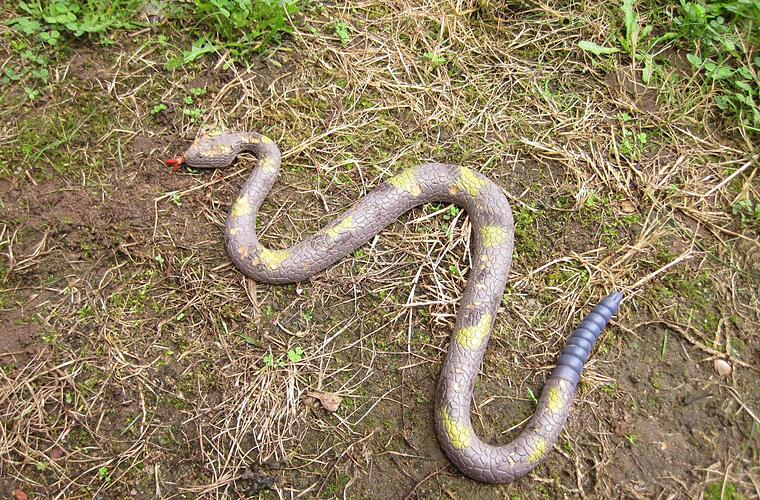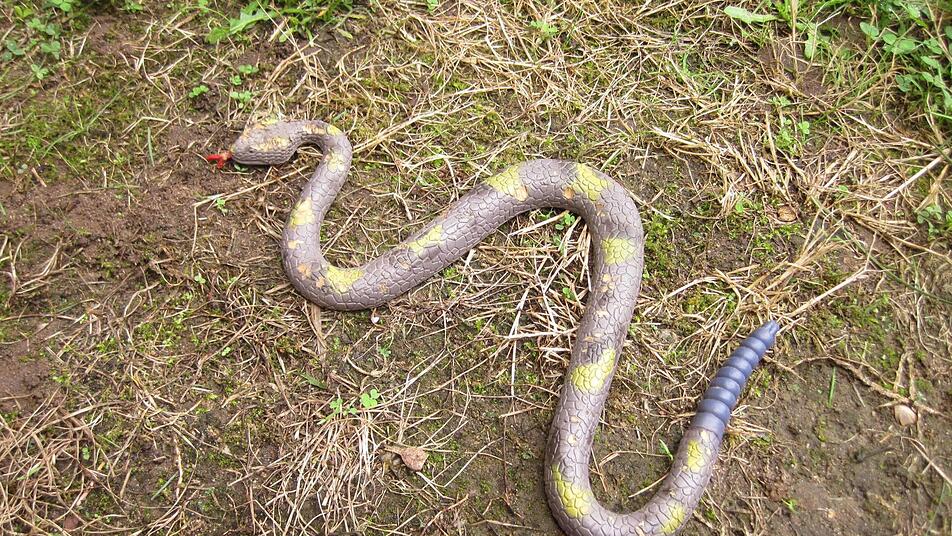 Die mutigen Beamten trauten sich näher an das gefährliche Reptil heran und konnten Entwarnung geben - die hochgiftige Klapperschlange entpuppte sich als eine etwa halben Meter lange Spielzeugschlange aus Gummi.