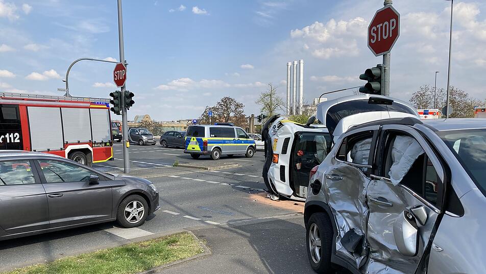 Im Kleinbus, der als Fahrdienst unterwegs war, befanden sich neben dem 73-jährigen Fahrer, eine Begleitperson und zwei Kinder im Alter von 8 und 17 Jahren. Der Kleinbus wurde über eine Verkehrsinsel in der Mainaustraße geschleudert und kippte zur Seite um. Das Auto des Unfallverursachers kam in einer Grünfläche neben der Fahrbahn zum Stehen. Zwei weitere Fahrzeuge, die in der Mainaustraße an einer Ampel verkehrsbedingt warteten, wurden durch ein umherfliegendes Verkehrsschild beschädigt.