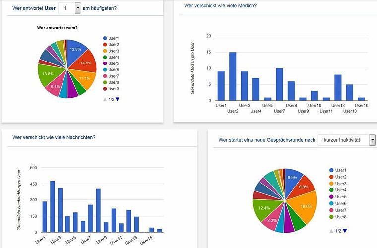 Die Statistiken, die der Nutzer empfängt, umfassen Werte zur Beteiligung der einzelnen Mitglieder an der Gruppendiskussion, welche Nutzer beispielsweise dazu neigen, immer das letzte Wort haben zu wollen, und geben einen ersten Eindruck davon, wer der "digitale Platzhirsch" in der Diskussion via WhatsApp ist.