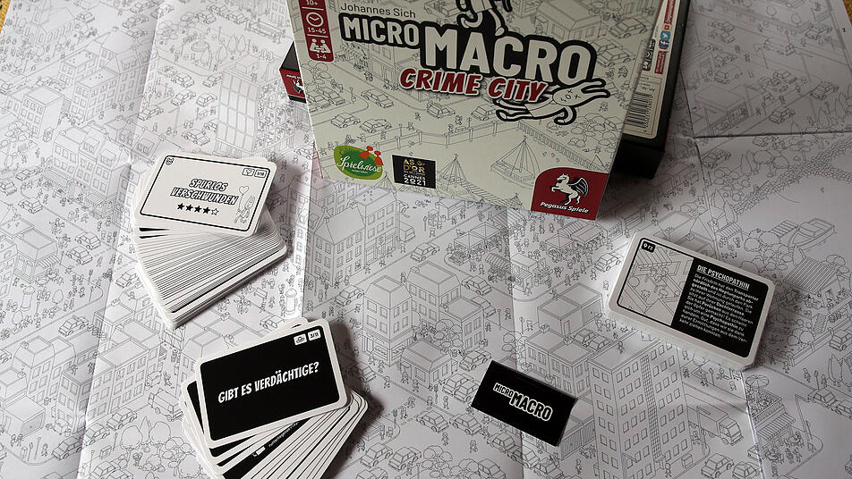 "MicroMacro: Crime City"ist Spiel des Jahres 2021: Ein großes Schwarzweiß-Poster eines Stadtplan und ein paar Karten - mehr braucht es nicht, um im Wimmelbildstil Dutzende Mord- und ...