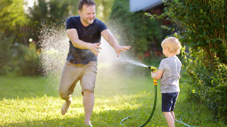 Fangen mit dem Gartenschlauch ist eine prima Abkühlung an heißen Tagen. Foto: Adobe Stock Maria Sbytova