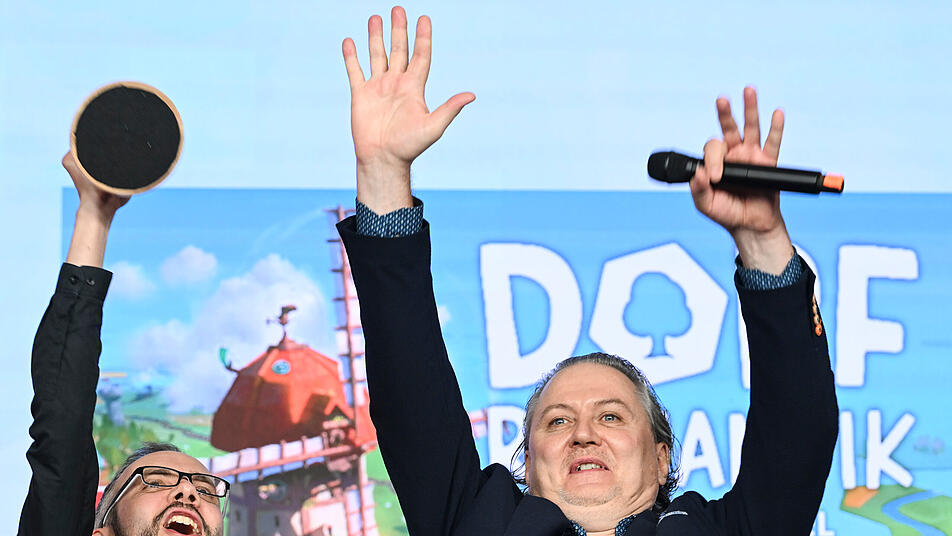 Die Spieleentwickler Lukas Zach (l) und Michael Palm freuen sich über die Wahl ihres Spiels «Dorfromantik: Das Brettspiel» zum «Spiel des Jahres 2023».