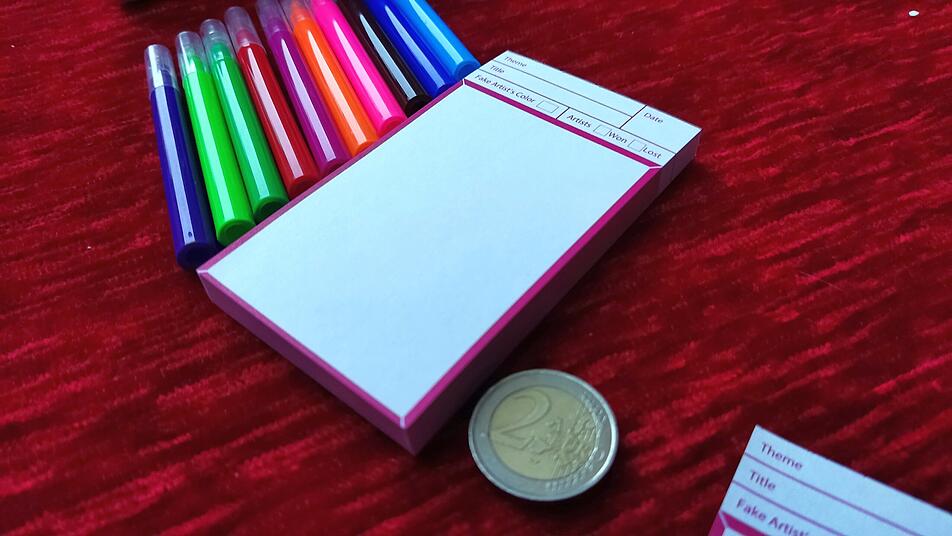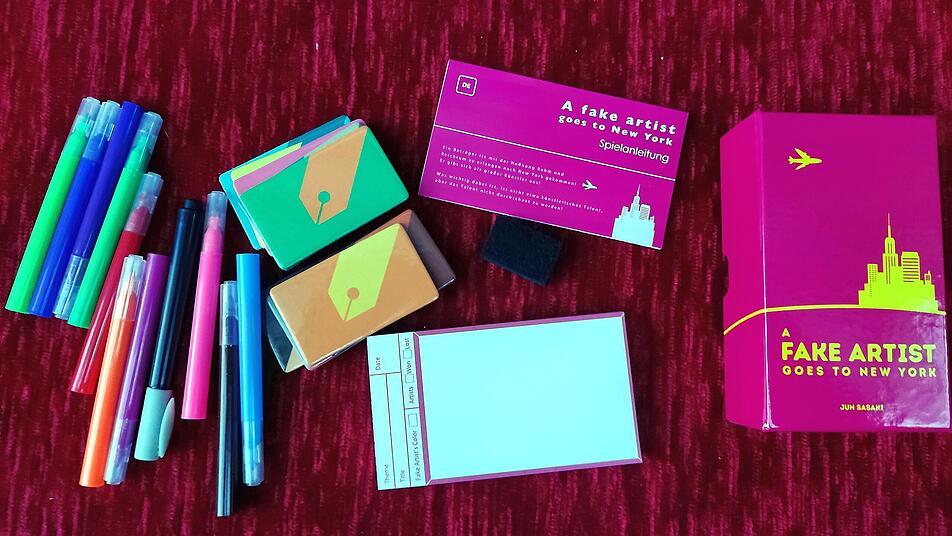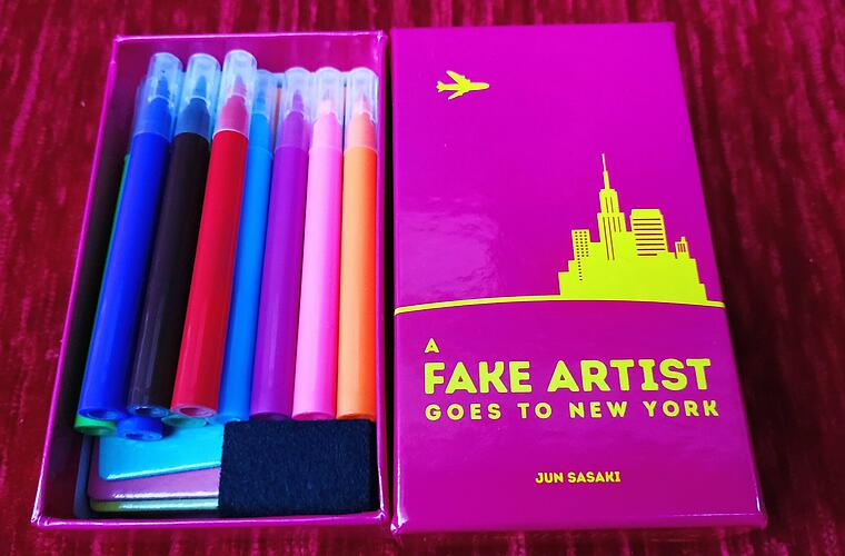 Wie vom japanischen Oink-Verlag gewohnt, reicht eine Mini-Schachtel, um das Spielmaterial unterzubringen: Für „Fake Artist goes to New York“ gibt es einen Block, ein Läppchen und zehn abwischbare Stifte in unterschiedlichen Farben. Dazu gibt es je ein Kunststoffkärtchen für jede*n Mitspielenden, auf das der/die Spielleiter/*in das zu malende Motiv schreibt. Nur bei dem falschen Künstler malt er/sie ein X, und dann benennt er/sie den/die Startspieler*in.