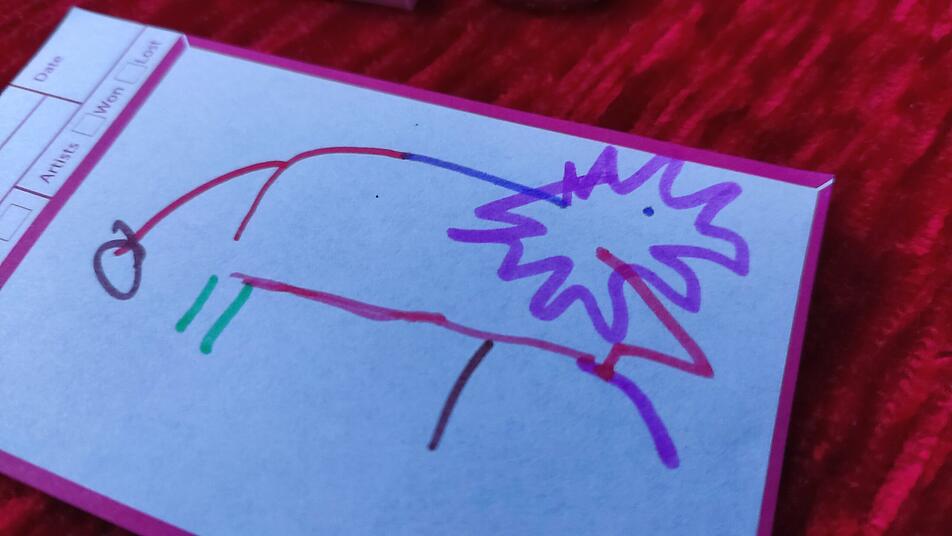 Reihum malt nun jede*r einen Strich, um das Motiv darzustellen. Der/die falsche Künstler*in kennt das Motiv nicht - und versucht, unauffällig mitzuzeichnen. Nach zwei Zeichenrunden deutet jede*r auf den/die vermeintliche*n Hochstapler*in.