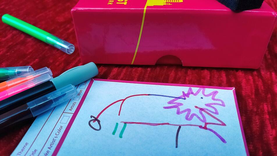 Das Partyspiel mit dem ungewöhnlichen Namen kommt mit so einfachen Regeln daher, dass alle Mitspielenden jederzeit einsteigen können, auch wenn sie keinerlei künstlerisches Talent mitbringen. Es für eine größere Runde gedacht, die kleine Schachtel aus dem Hauses Oink Games ist leicht zu transportieren. Während die charakteristisch-kompakten Boxen bei anderen Oink-Spielen keine Nachteile mit sich bringen, ist das hier anders: Der Malblock ist bei vielen Teilnehmer*innen zu klein, um von jedem gut gesehen zu werden. Hier sollte man sich mit einem größeren Blatt Papier behelfen. Weiter sollte beim Aufheben der Motivkärtchen vorsichtig vorgegangen werden, da die Schrift leicht verwischt. Ein weiteres Manko des Spiels: Die Gruppe sollte groß genug sein - wir empfehlen ein Minimum von sechs Spielenden, auch weil eine/r am Tisch immer als Spielleiter*in fungiert und beim Malen und Entlarven außen vor ist.