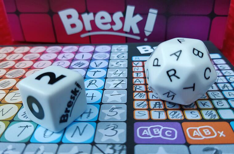 „Bresk“ ist ein Roll-And-Write-Spiel der anderen Art: Hier stehen nicht Zahlen, sondern Buchstaben im Fokus. Wir waren neugierig, wie sich diese Art Kreuzworträtsel spielt, haben den Alphabet-Würfel gerollt und mit großem Eifer Buchstaben vertikal und horizontal auf dem Block verteilt, um sinnvolle Wörter zu bilden. Hier ist das Ergebnis.