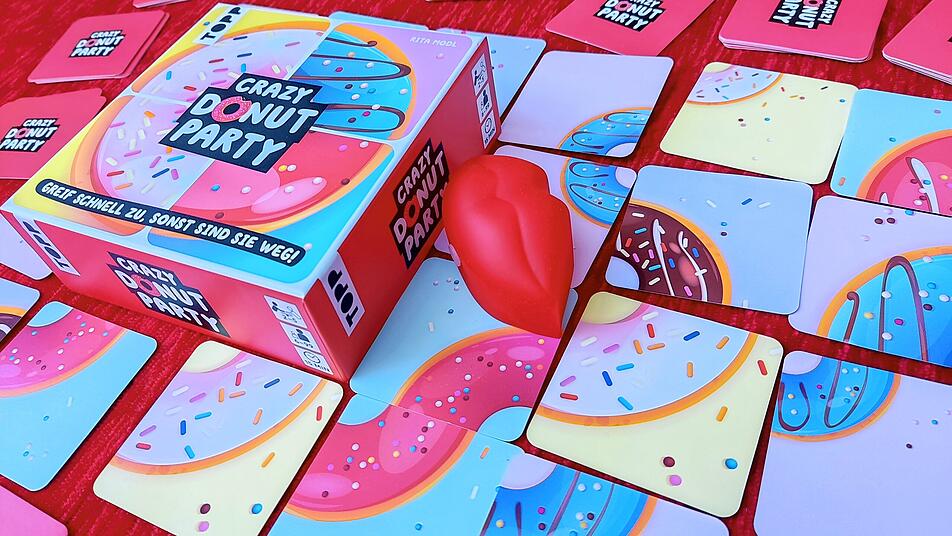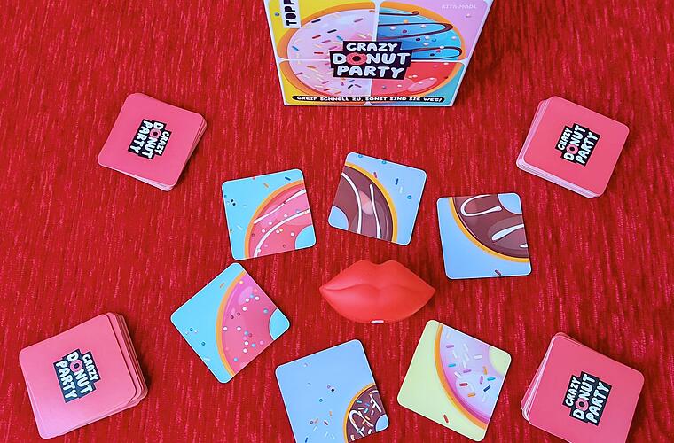Es ist tatsächlich so: Donuts gibt es in den unterschiedlichen Toppings, von rosa Zuckerguss bis zu dunklen Schokostreuseln. Im Kartenspiel „Crazy Donut Party“ gilt es, vier Teile zu einem Gebäckstück zusammenzusetzen. Dabei ist Geschwindigkeit gefragt, denn nur wer als erster auf den rotlippigen Buzzer haut, wenn die richtigen Karten aufgedeckt werden, darf sie einsammeln. Auch wir haben ausprobiert, wie viel Spielspaß es mitbringt.