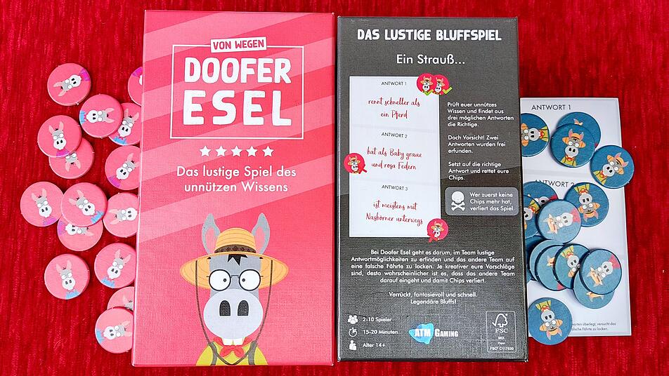 „Doofer Esel“ heißt mit vollem Namen „(Von wegen) Doofer Esel - Das lustige Kartenspiel des unnützen Wissens“. Es stammt vom Münchner Spiele-Startup ATM Gaming, das mit „Oha!“ bereits ein Partyspiel mit nichtssagendem Titel veröffentlicht hat – und das dennoch in unserer Runde überzeugen konnte (zur Rezension).