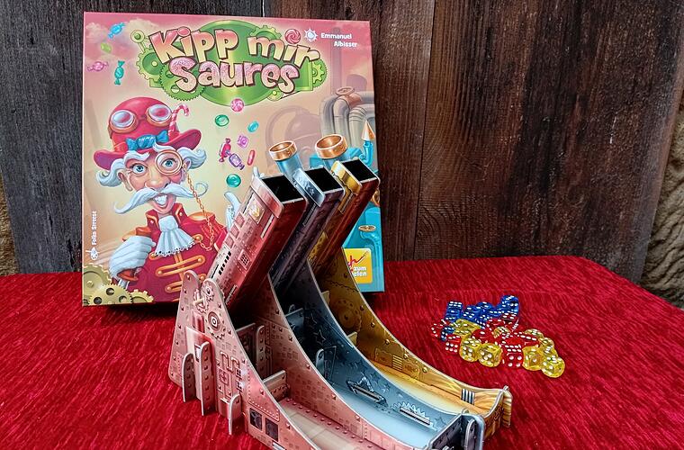 Kipp mir Saures ist zwar ein witziger Gaga-Titel, gekippt werden hier allerdings Würfel, um damit Süßes zu produzieren. Highlight ist der Mechanismus, der die Würfel zum Rollen bringt, die letztlich Material für eine Bonbon-Fabrik liefern. Doch funktioniert auch der Rest des süß-sauren Spiels? Wir haben gekippt und geschaut, was unten rauskommt.