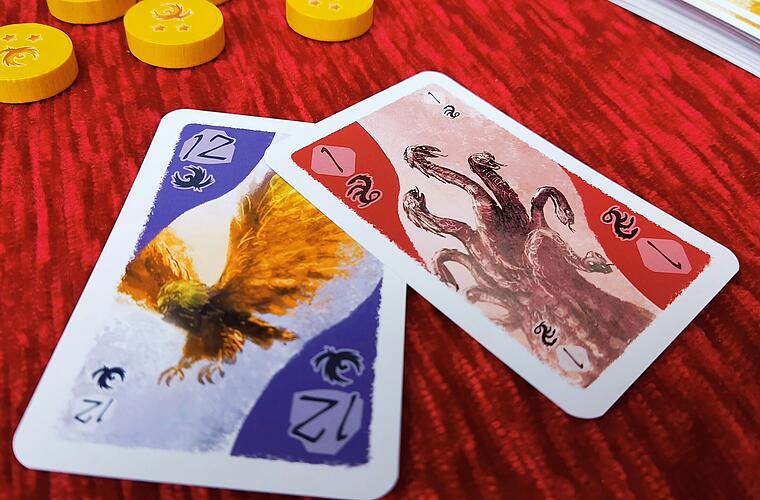 Eine Hydra zeigen die schwächsten Karten mit den Werten 1 bis 5, da mit ihnen ein Stich am schwierigsten ist, ist der entsprechende Chip vier Siegpunkte wert; der Pegasus mit den Kartenwerten 6 bis 9 bringt drei Siegpunkte; für die relativ leichten Stiche mit den Phönix-Karten, die immer die Werte 10, 11 und 12 haben, gibt es zwei Siegpunkte.