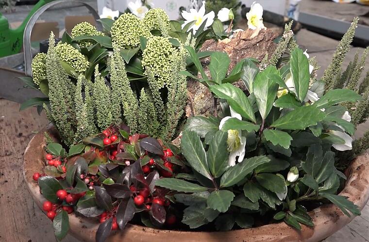 Eine winterliche Blumenschale schmückt in der kalten Jahreszeit Ihren Außenbereich. Egal, ob Balkon, Terrasse oder Vorgarten! Diese winterharte Bepflanzung mit Christrosen, Erika und Schneebeeren verziert die triste Winterlandschaft.