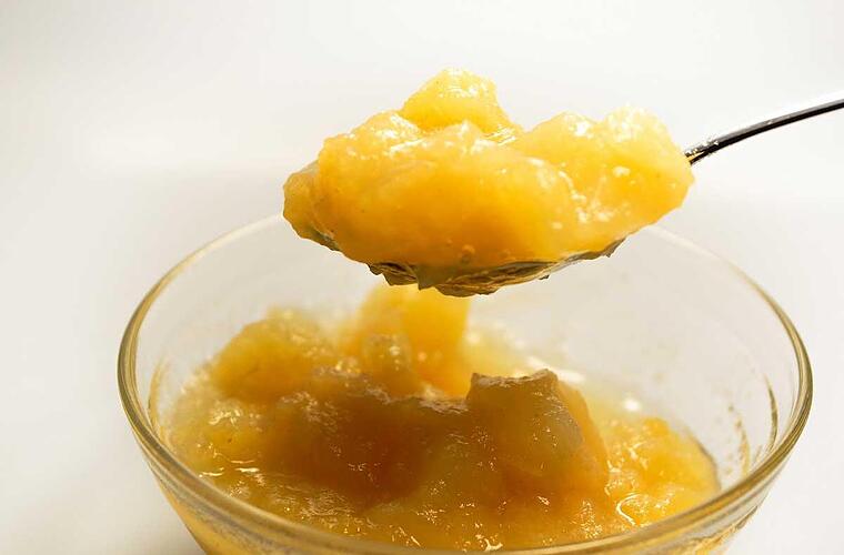 - Anschließend auf mittlere Hitze reduzieren und 10-15 Minuten köcheln lassen. Je nach Geschmack die großen Apfelstücke mit einer Gabel zerdrücken.