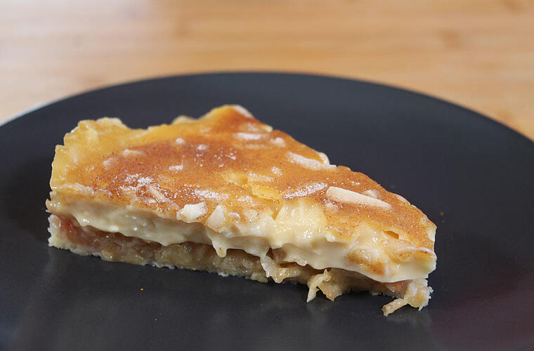 - Den Teig auf dem Boden der Springform verteilen, dabei darauf achten, dass er überall gleich dick ist. Die geriebenen Äpfel auf dem Teig verteilen. Die Puddingcreme über die Äpfel gießen und gleichmäßig verteilen. Zum Schluss mit den Mandelblättchen und dem Zimtzucker bestreuen.