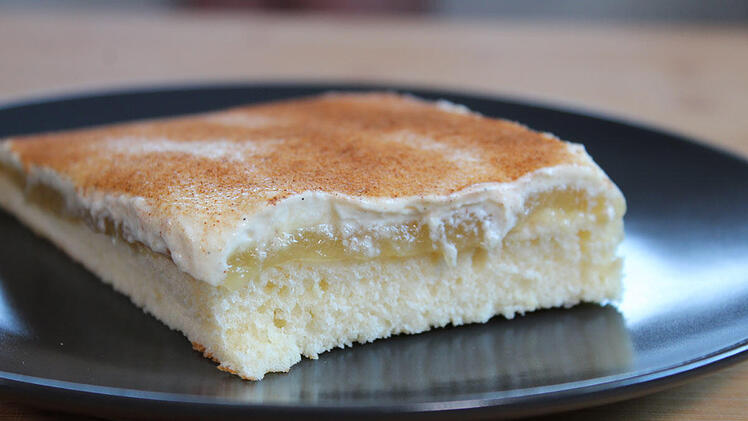 Den Kuchen abkühlen lassen und mit Apfelmus bestreichen.