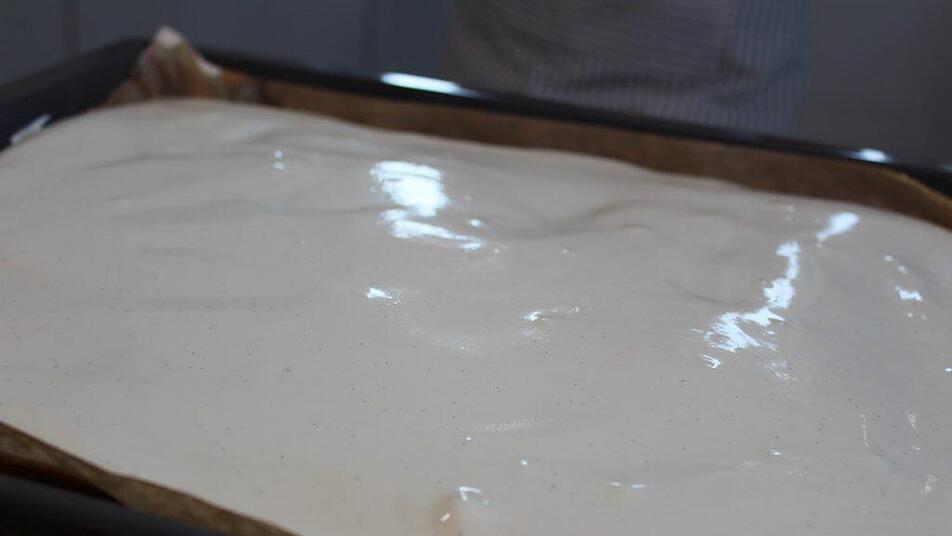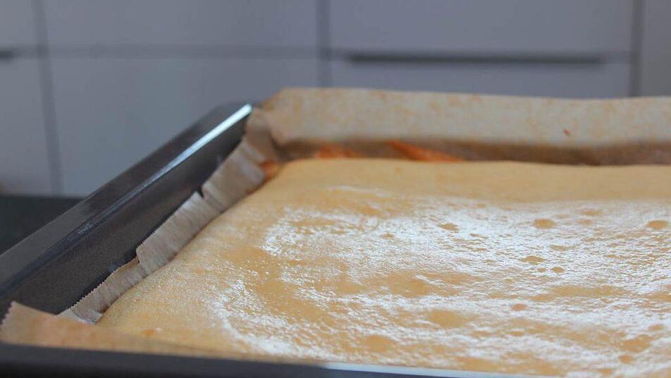 Den Teig gleichmäßig auf ein mit Backpapier belegtes Blech oder eine eingefettete Backform geben und im vorgeheizten Backofen bei 180 Grad Ober- und Unterhitze 15-20 Minuten backen.