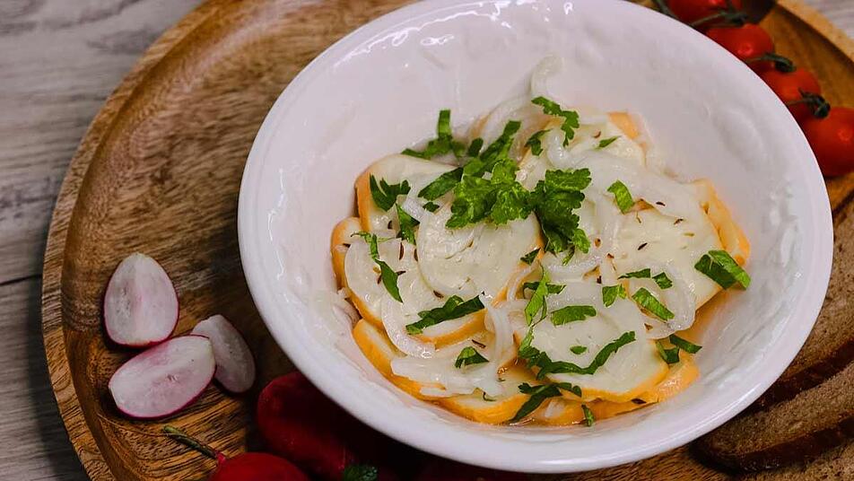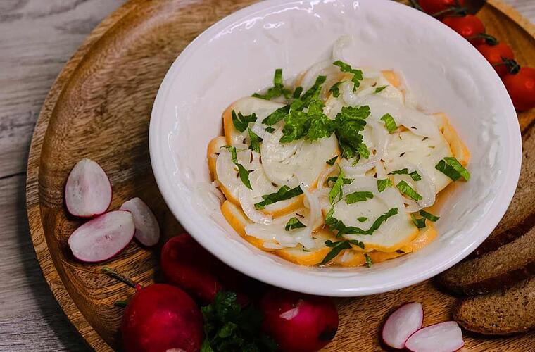 - Essig mit 5 EL Wasser, einer Prise Zucker, Kümmel, Salz und Pfeffer verrühren. Öl unterrühren und die Zwiebeln in die Mischung hineingeben.