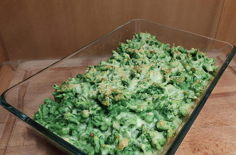 - Die Bärlauchkäsespätzle für circa 15 min in den Ofen geben, bis der Käse gebräunt ist. Herausnehmen und genießen!