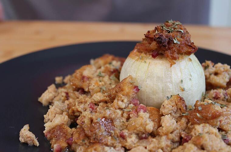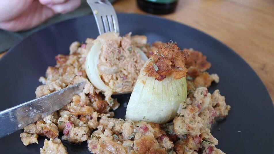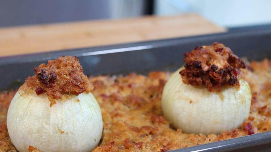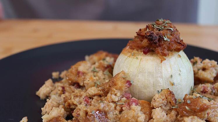 Sobald die Zwiebeln gar sind, herausnehmen und auf einen Teller geben. Die Füllung um die Zwiebeln verteilen, mit dem Bratensaft übergießen und mit Petersilie garnieren.