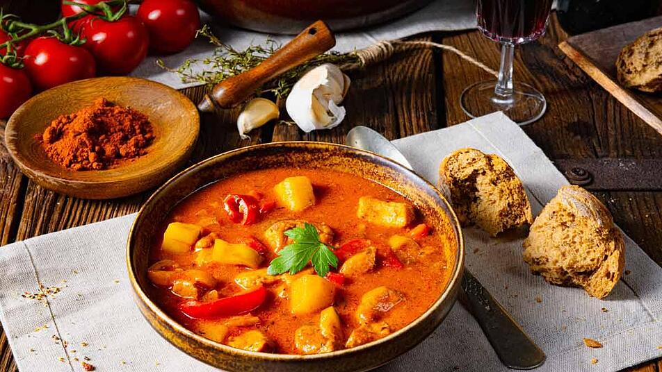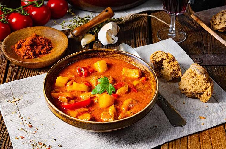 - Lösche nun das Ganze mit Brühe und den gehackten Tomaten ab. Füge auch die Kartoffeln hinzu und lasse alles für 20 bis 30 Minuten köcheln, bis das Fleisch und das Gemüse gar sind.
