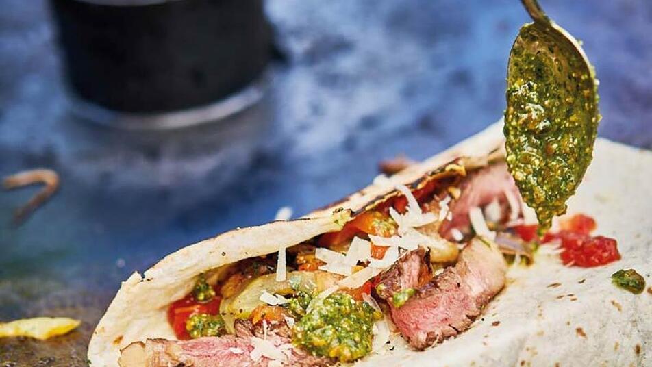 Bei den Grillrezepten von Giuseppe Messina reicht die richtige Grilltechnik allein oft nicht aus - seiner Kreativität sind nämlich kaum Grenzen gesetzt. Beim folgenden Rezept muss man auch die richtige Wickeltechnik beherrschen, denn die zarte Rinderlende schneidet er nach dem Grillen in Streifen und packt sie dann mit Gemüse, selbstgemachter Salsa, Pesto und Käse in Maisfladen. Das überzeugende Ergebnis: kompakte Wraps mit köstlicher Füllung.