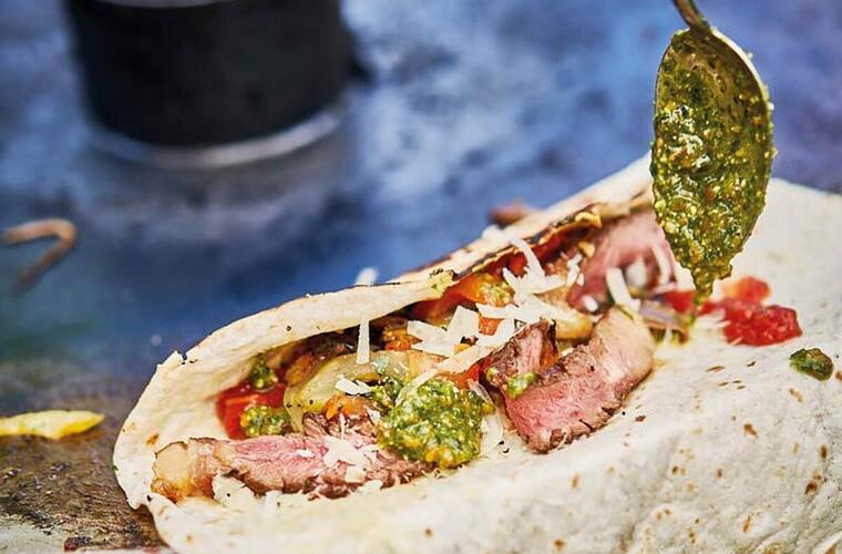 - Die Maisfladen auf der Plancha erwärmen und mit Käse bestreuen, sodass der Käse leicht schmilzt. Dann mit etwas Gemüse und Rinderlendestreifen sowie Salsa und Pesto füllen und zu einem Wrap einrollen.