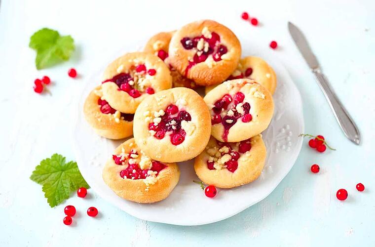 - Die Quarkcreme auf die Mitte der Taler geben und die Beeren darauf verteilen. Die Beeren-Taler etwa 20 Minuten backen.