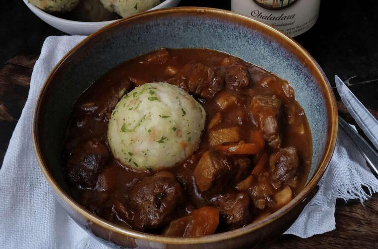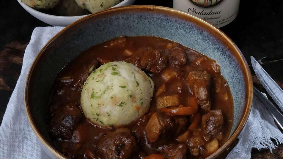 - Die Kräuterstiele aus dem Bierfleisch entfernen und mit Salz und Pfeffer abschmecken. Knödel anrichten und mit dem Bierfleisch servieren.