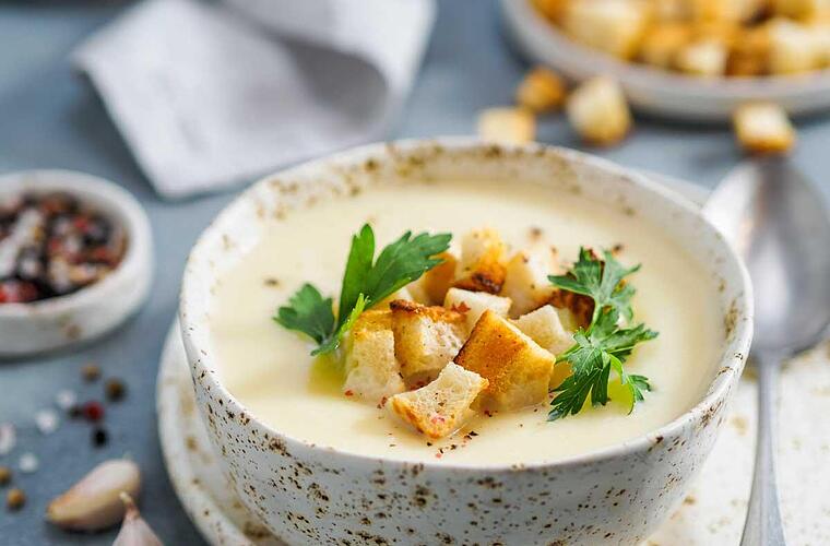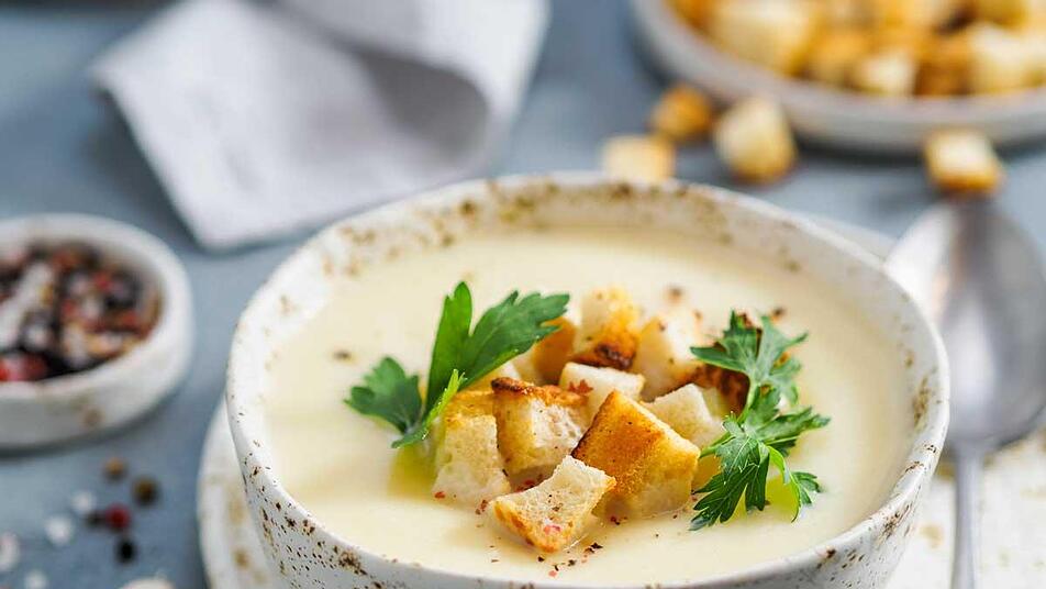 - In einer Pfanne die Butter erhitzen und die Brotwürfel dazugeben und rösten.