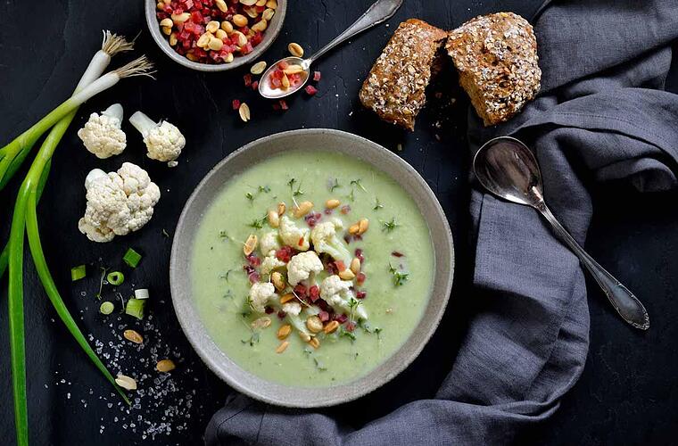 Unsere Blumenkohlsuppe ist genau das Richtige, wenn’s draußen kalt wird. Der Blumenkohl macht sie schön cremig, und der Meerrettich gibt ihr eine angenehme Schärfe, die richtig wach macht. Es ist ein einfaches, aber tolles Gericht, das schön von innen wärmt. Am besten passt dazu ein frisches Stück Bauernbrot oder etwas Körniges - so wird es richtig gemütlich. Schnell gemacht und einfach lecker, perfekt für einen entspannten Abend!