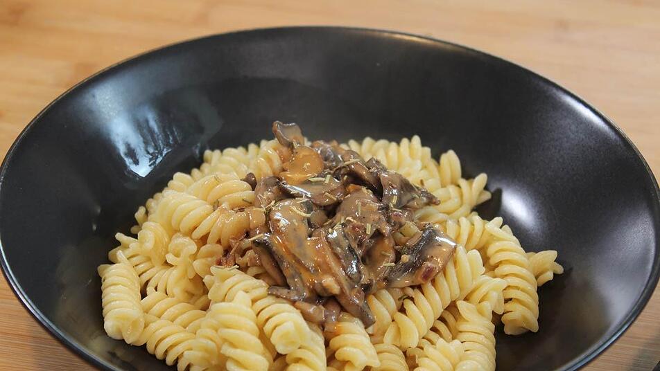 - Pasta in einem Topf nach Packungsanweisung kochen. Öl in eine Pfanne geben und Zwiebelwürfel darin anbraten. Gepressten Knoblauch, Champignons und Rosmarin hinzugeben und alles zusammen mehrere Minuten gut anbraten.