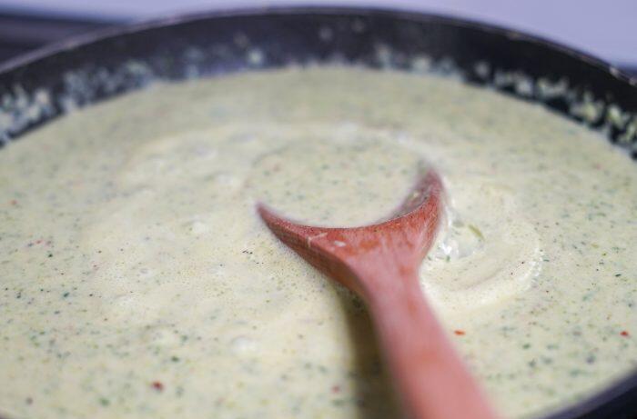 Nun die Sahne und die Gewürze hinzugegeben und wir lassen alles circa 10 Minuten köcheln. Umrühren nicht vergessen!