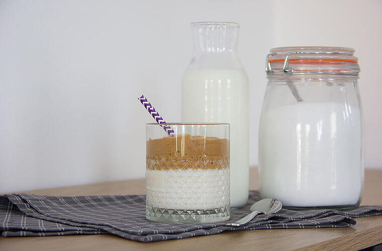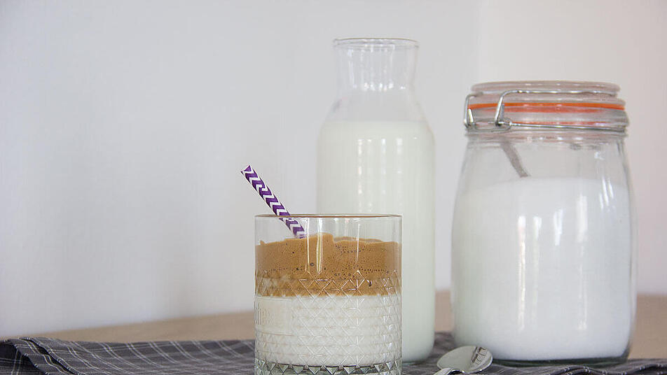 - Jetzt die Milch leicht erhitzen und in die Kaffeetasse geben. Wer mag, kann den Kaffee auch kalt in einem Glas genießen.
