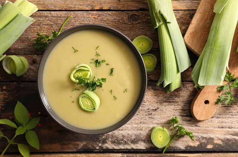 - Pflanzenöl in einem großen Topf erhitzen und Lauch, Kartoffeln und Zwiebeln einige Minuten glasig dünsten. Anschließend mit der Brühe ablöschen, sodass das Gemüse bedeckt ist. Mit Salz und Pfeffer würzen und etwa 30 Minuten kochen lassen.
