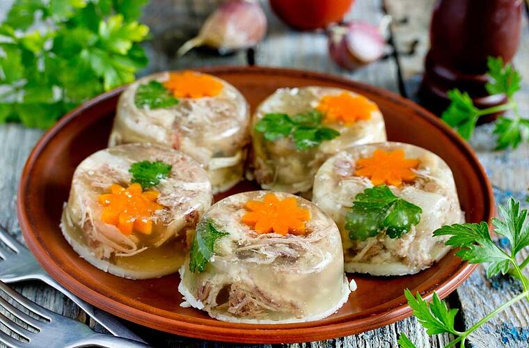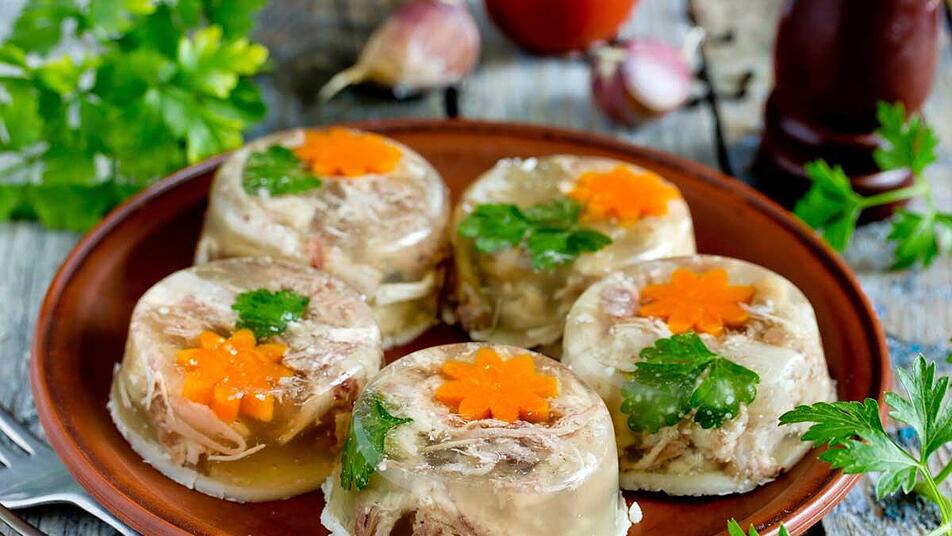 - Die Brühe vorsichtig abseihen erkalten lassen, sorgfältig entfetten und anschließend wieder erwärmen. Die Sulzflüssigkeit kräftig abschmecken und über die Fleischteile in den Teller gießen, sodass die Einlage bedeckt ist.