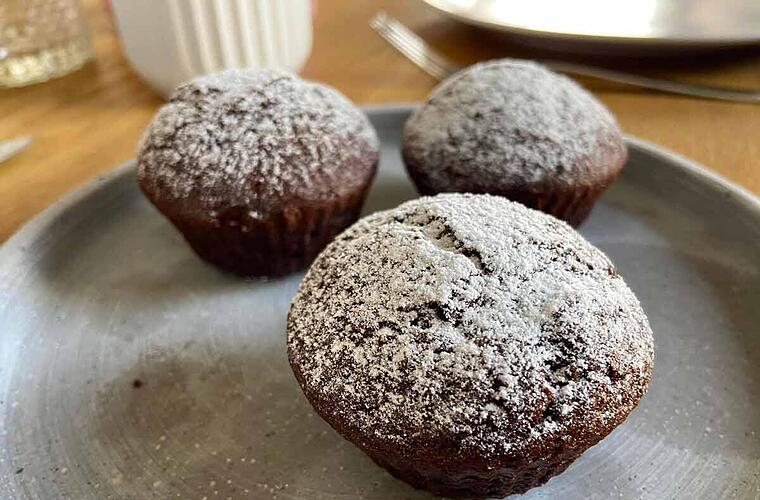 - Nun den Schoko-Teig gleichmäßig in die vorbereiteten Muffinförmchen füllen und im vorgeheizten Backofen circa 25 Minuten backen. Am Ende mithilfe eines Stäbchens prüfen, ob die Schoko-Muffins durch sind. Dann vollständig abkühlen lassen.