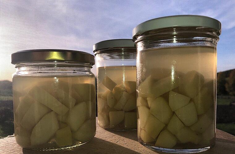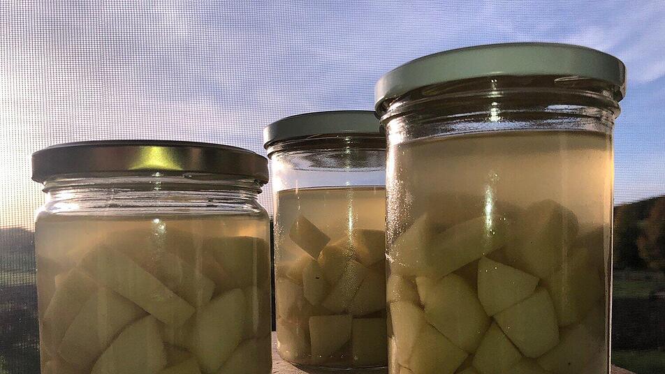 - Birnen in Gläser abfüllen. Abgeseihten Weinsud über die Früchte gießen, bis sie vollständig bedeckt sind. Die Gläser verschließen und 15 Minuten auf den Deckel stellen. Die Wein-Birnen sind ca. 5 Wochen haltbar.