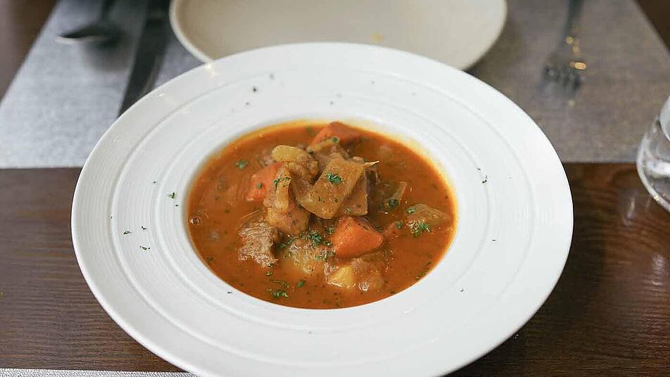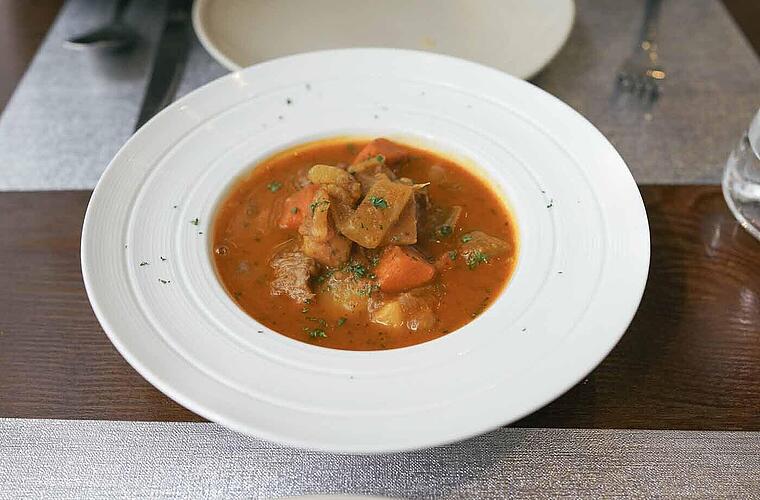 - Die Hähnchenbrustfilets unter fließendem kalten Wasser abspülen, trocken tupfen und in zwei mal zwei Zentimeter große Stücke schneiden, dann salzen und pfeffern. Das Schweinegulasch ebenfalls salzen und pfeffern.