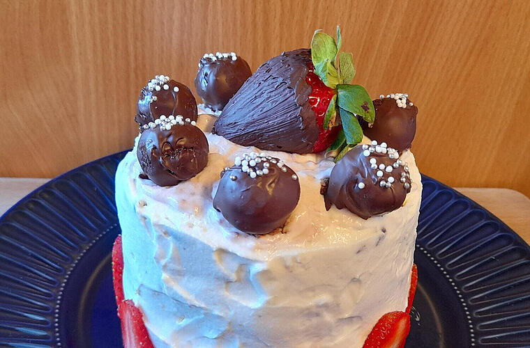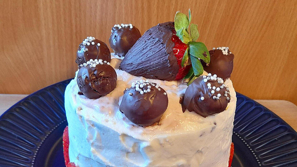 - Die restliche Creme um die Torte herum verstreichen. Die Torte mit den Cakepops und der Schoko-Erdbeere belegen und die restlichen Erdbeerscheiben um die Torte herum verteilen.