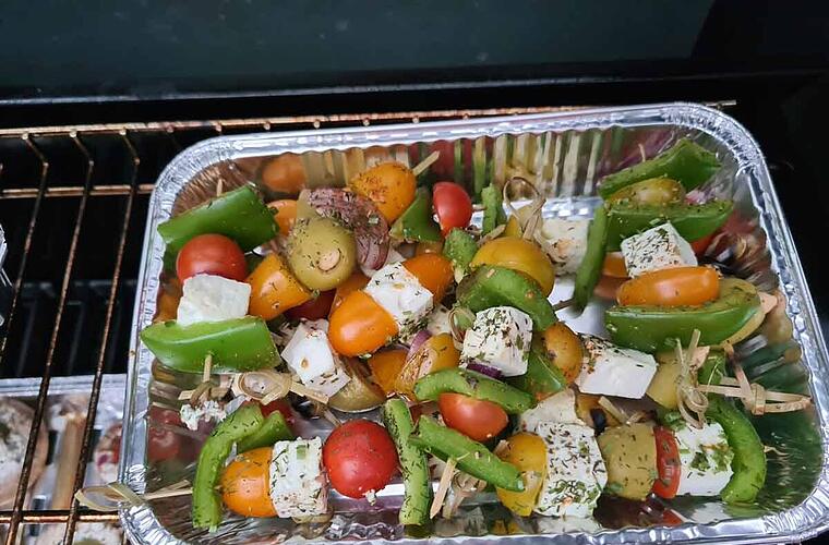 - Entweder eine fertige Alu-Form oder zwei Stücke Alufolie vorbereiten: Das Gemüse mittig als Masse verteilen und den Feta darüber geben oder alles nacheinander auf Spieße stecken. Danach jeweils 2 EL von dem Olivenöl darüber gießen, nach Belieben würzen und die Päckchen mit Alufolie verschließen.