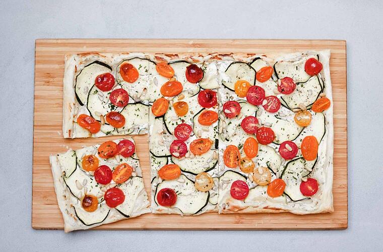 - Die Zucchini in längliche Streifen schneiden und den Teig belegen, anschließend die Cocktailtomaten halbieren und hinzugeben. Tipp: Die Tomatenhälften mit der aufgeschnittenen Seite nach oben aufs Blech legen.